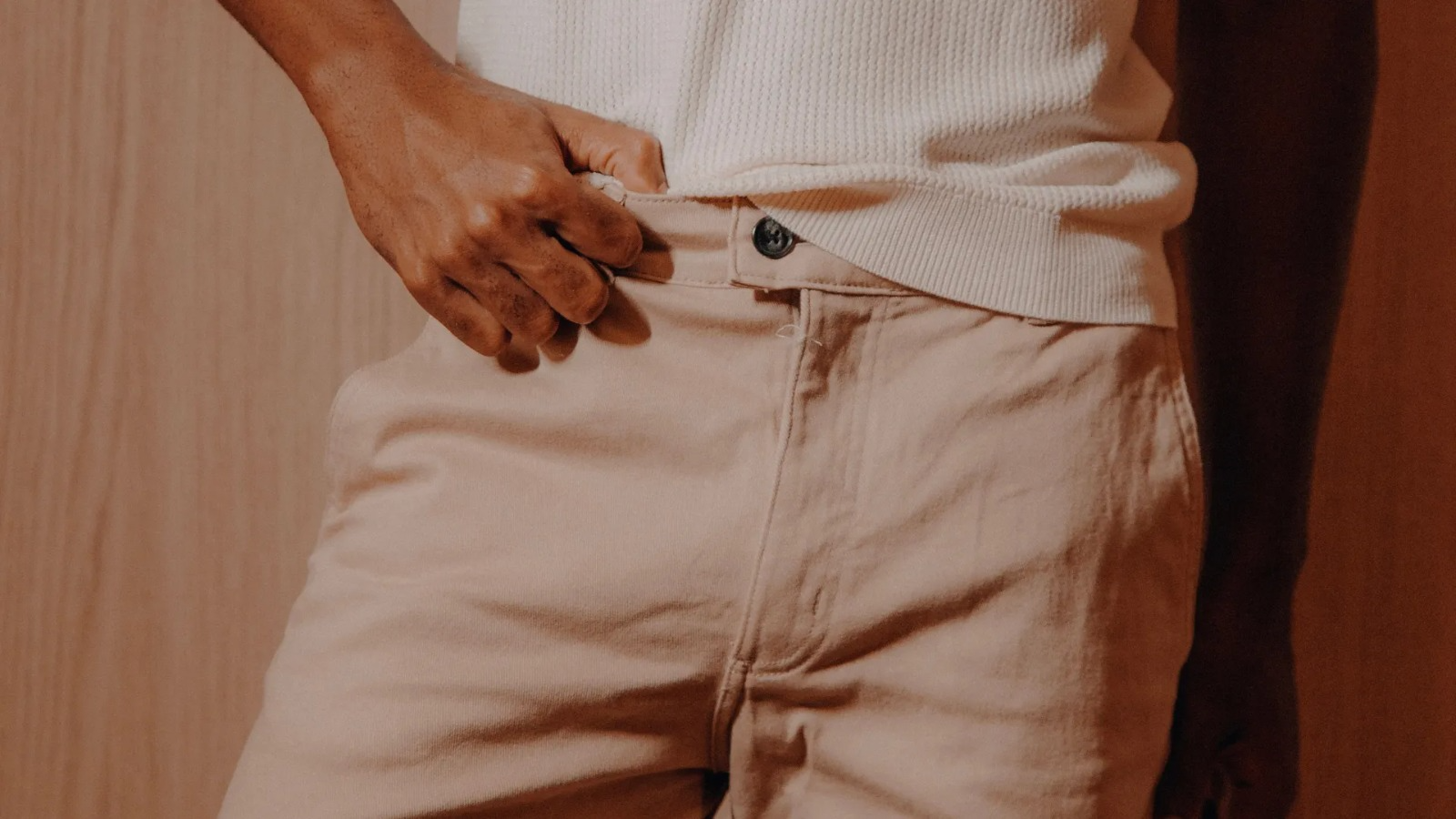 Detalhes: Bolsos laterais funcionais, cós reforçado, fechamento em botão.